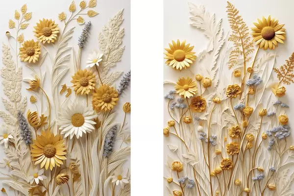 Poster Una colección texturizada de margaritas amarillas y blancas con hierbas secas y ramitas de lavanda sobre un fondo blanco. d01241
