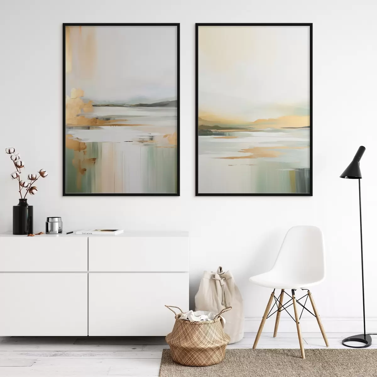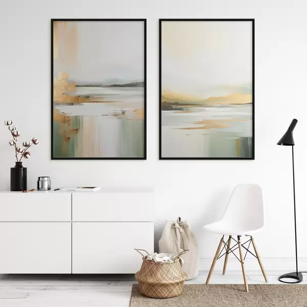 Poster Paisaje abstracto con tonos amarillos y verdes, agua que refleja el cielo y montañas lejanas, cielo pálido y brumoso. d01245