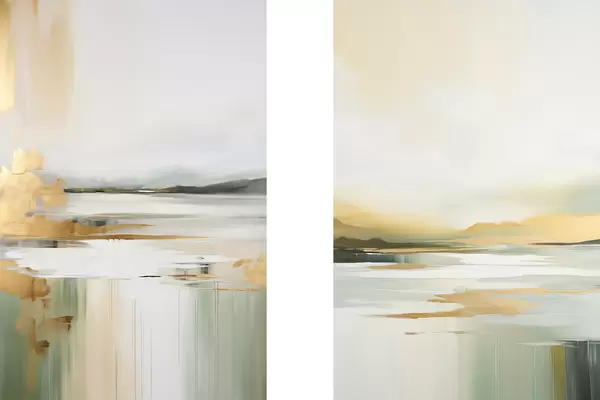 Poster Paisaje abstracto con tonos amarillos y verdes, agua que refleja el cielo y montañas lejanas, cielo pálido y brumoso. d01245