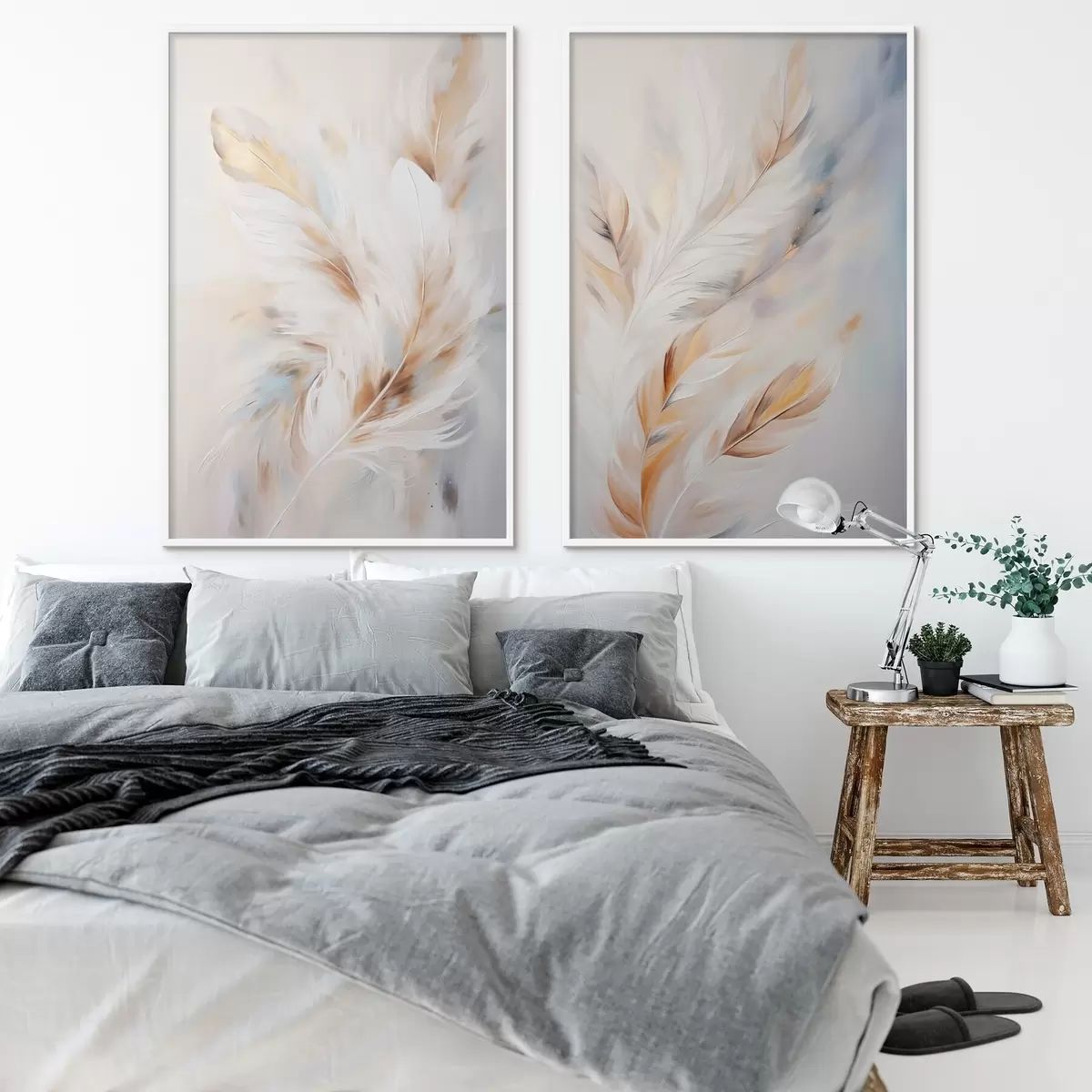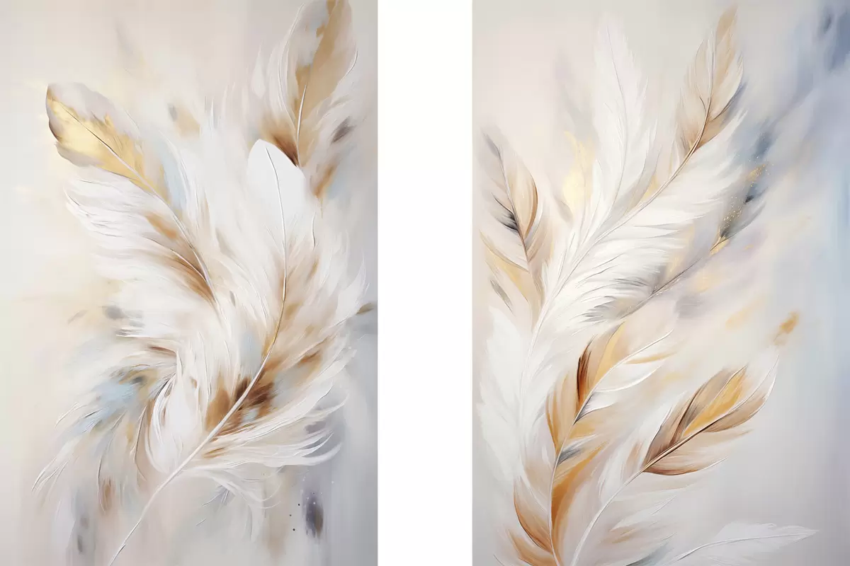 Poster Plumas grandes y suaves con una mezcla de tonos blancos, amarillos y marrones, sobre un fondo claro y abstracto. d01247