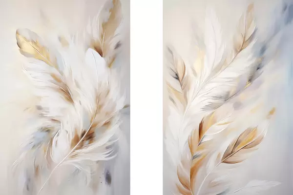 Poster Plumas grandes y suaves con una mezcla de tonos blancos, amarillos y marrones, sobre un fondo claro y abstracto. d01247
