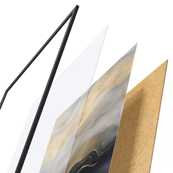 El póster consta de marco, plexiglás, imagen impresa y soporte de aglomerado. El póster puede colgarse inmediatamente en la pared gracias a los soportes de la parte posterior.