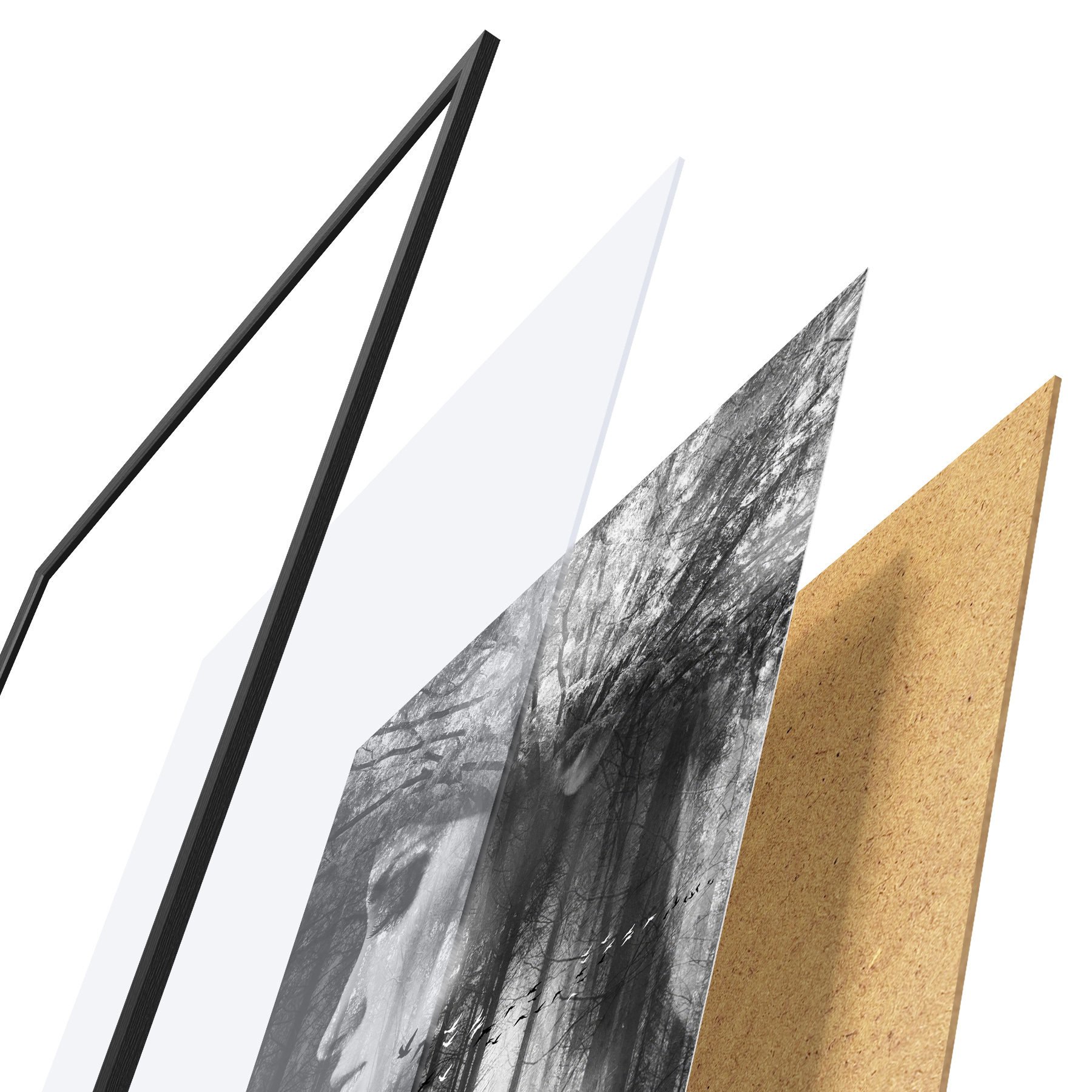 El póster consta de marco, plexiglás, imagen impresa y soporte de aglomerado. El póster puede colgarse inmediatamente en la pared gracias a los soportes de la parte posterior.