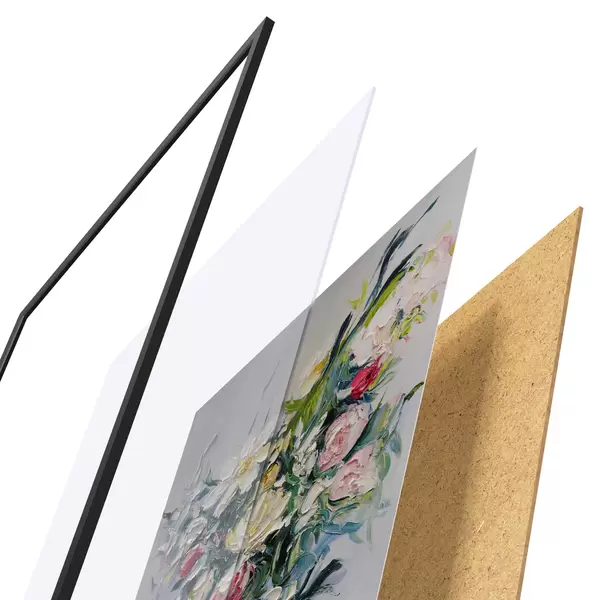 El póster consta de marco, plexiglás, imagen impresa y soporte de aglomerado. El póster puede colgarse inmediatamente en la pared gracias a los soportes de la parte posterior.