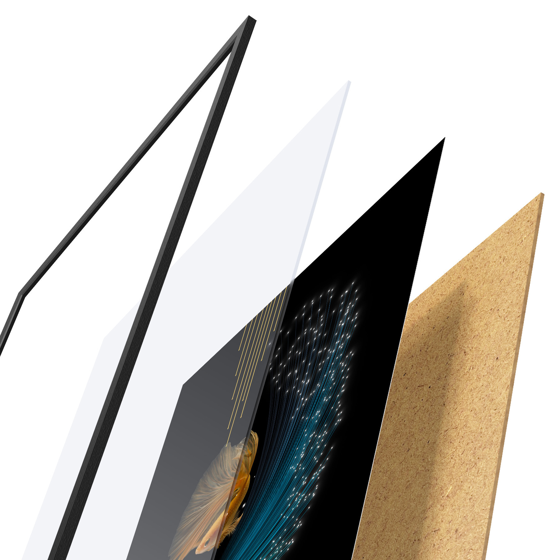 El póster consta de marco, plexiglás, imagen impresa y soporte de aglomerado. El póster puede colgarse inmediatamente en la pared gracias a los soportes de la parte posterior.