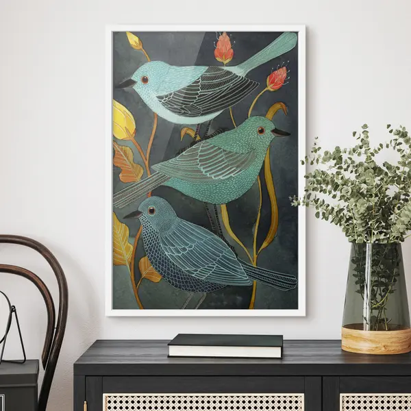 Poster Pájaros de colores en medio de un follaje vibrante f03061