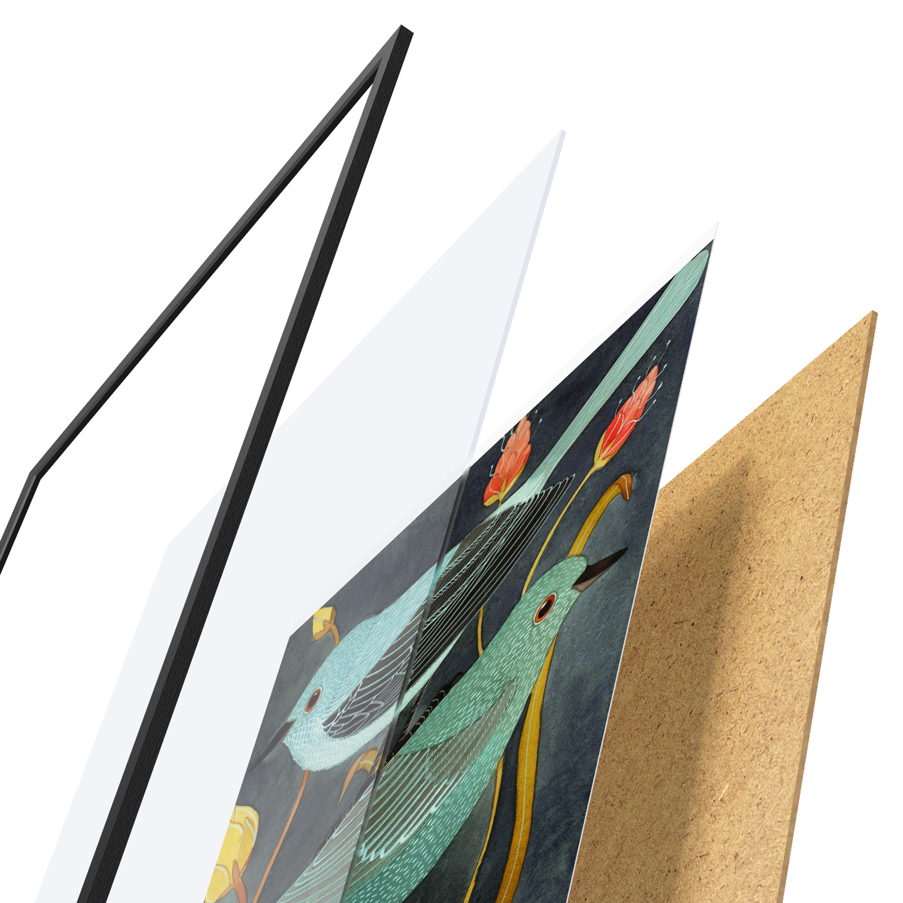 El póster consta de marco, plexiglás, imagen impresa y soporte de aglomerado. El póster puede colgarse inmediatamente en la pared gracias a los soportes de la parte posterior.