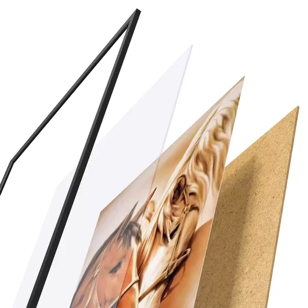 El póster consta de marco, plexiglás, imagen impresa y soporte de aglomerado. El póster puede colgarse inmediatamente en la pared gracias a los soportes de la parte posterior.