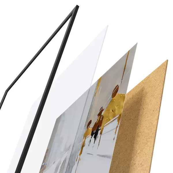 El póster consta de marco, plexiglás, imagen impresa y soporte de aglomerado. El póster puede colgarse inmediatamente en la pared gracias a los soportes de la parte posterior.