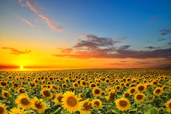 Poster Campo de girasoles al atardecer. Una vista preciosa. f05429