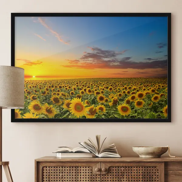 Poster Campo de girasoles al atardecer. Una vista preciosa. f05429