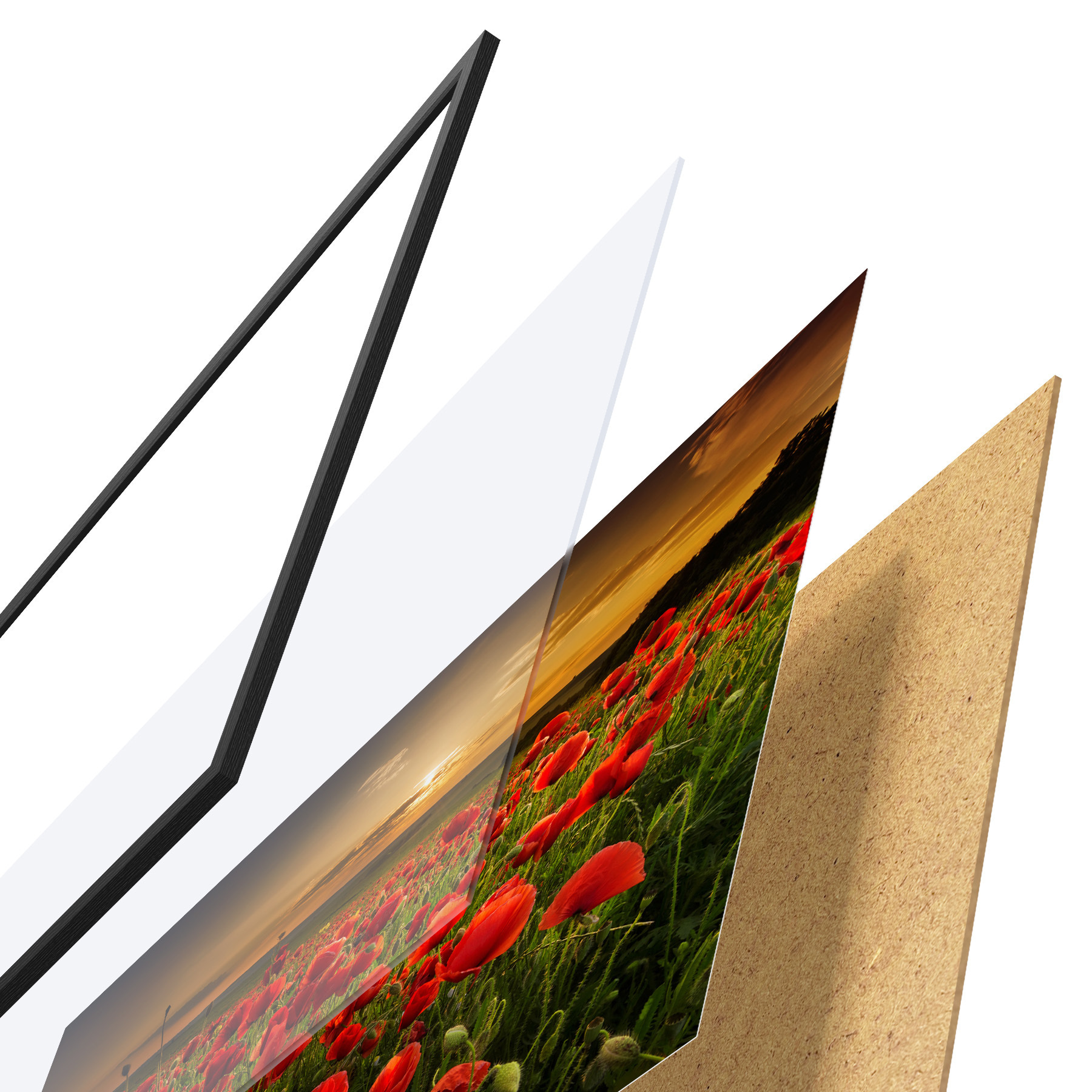 El póster consta de marco, plexiglás, imagen impresa y soporte de aglomerado. El póster puede colgarse inmediatamente en la pared gracias a los soportes de la parte posterior.