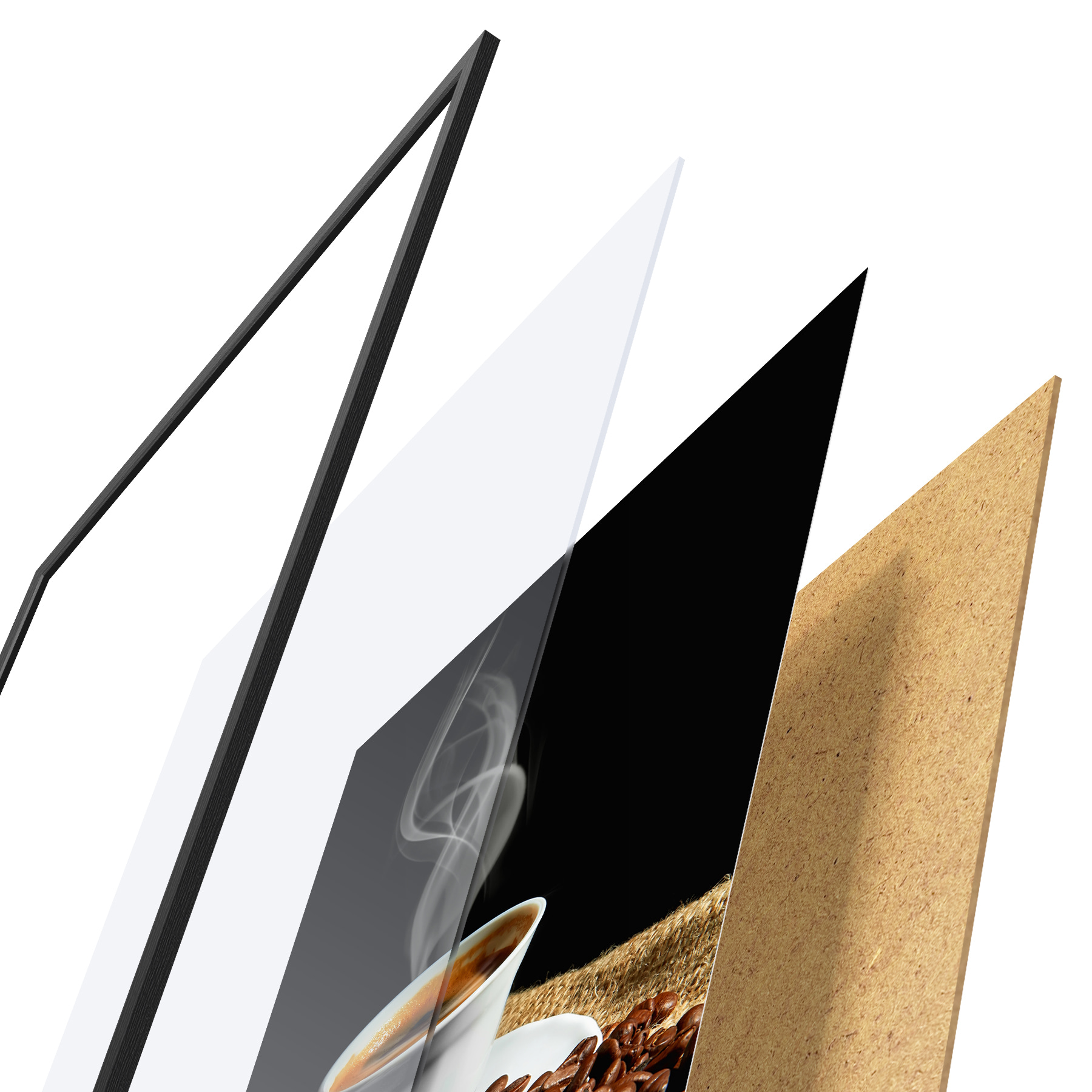 El póster consta de marco, plexiglás, imagen impresa y soporte de aglomerado. El póster puede colgarse inmediatamente en la pared gracias a los soportes de la parte posterior.