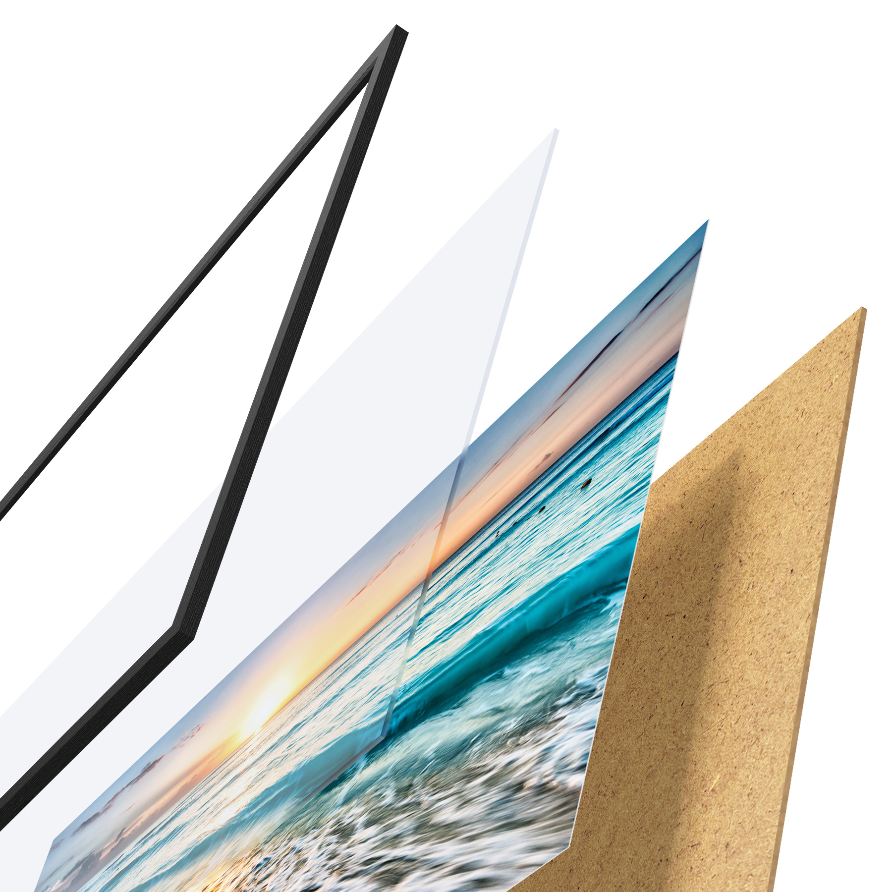 El póster consta de marco, plexiglás, imagen impresa y soporte de aglomerado. El póster puede colgarse inmediatamente en la pared gracias a los soportes de la parte posterior.