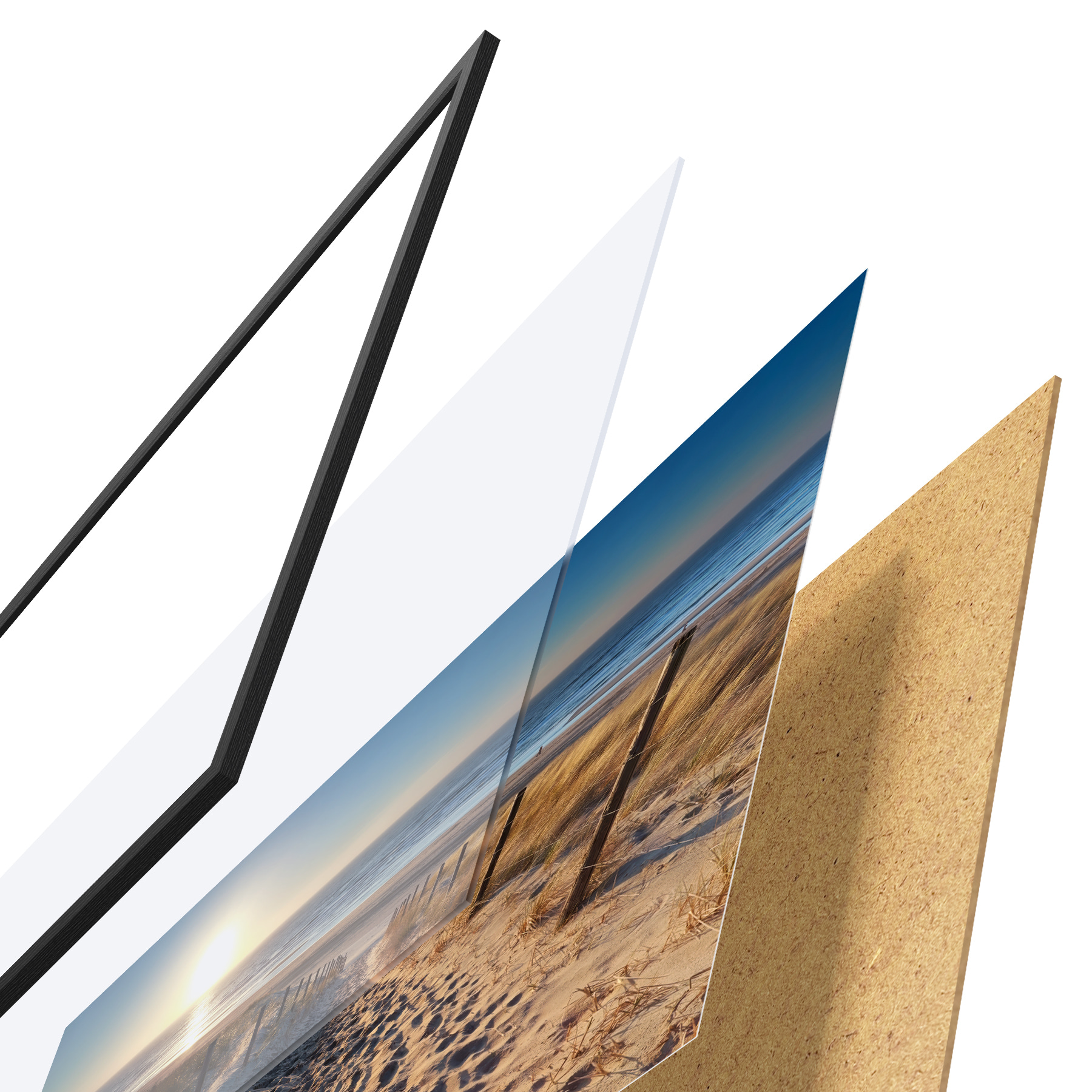 El póster consta de marco, plexiglás, imagen impresa y soporte de aglomerado. El póster puede colgarse inmediatamente en la pared gracias a los soportes de la parte posterior.