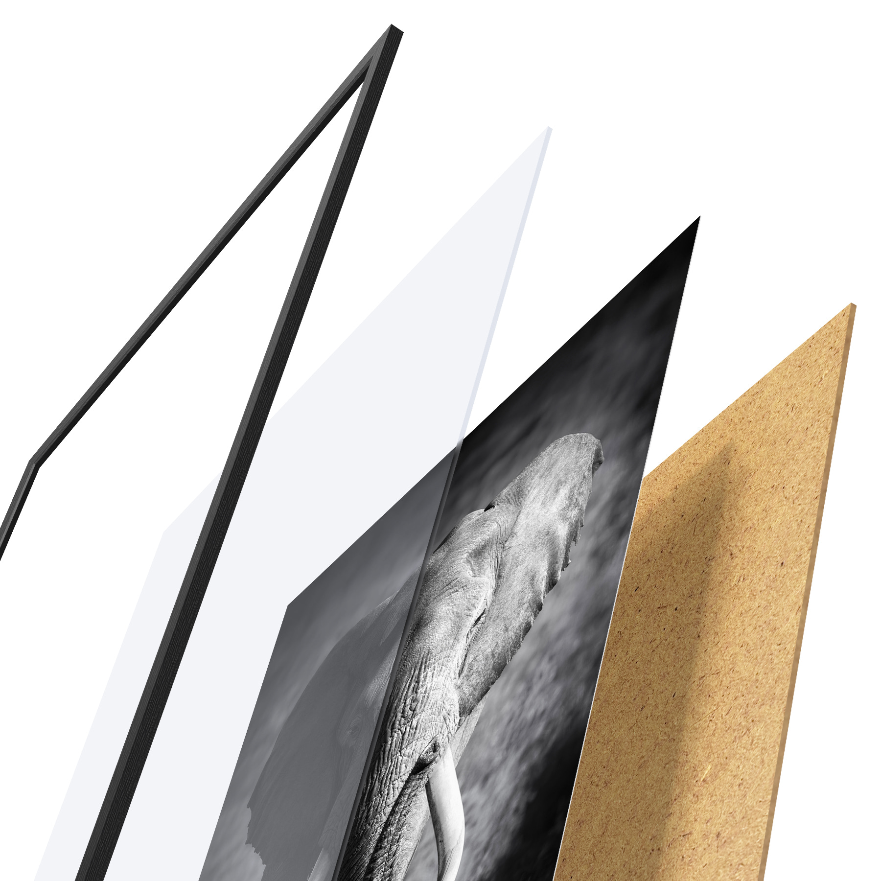 El póster consta de marco, plexiglás, imagen impresa y soporte de aglomerado. El póster puede colgarse inmediatamente en la pared gracias a los soportes de la parte posterior.