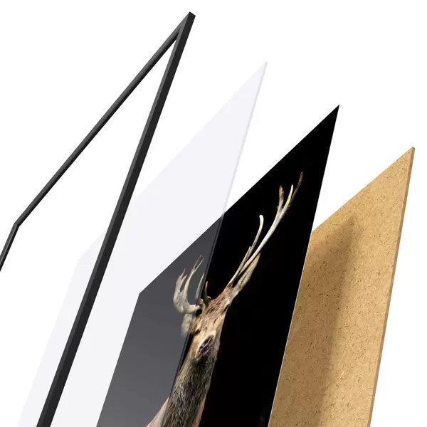 El póster consta de marco, plexiglás, imagen impresa y soporte de aglomerado. El póster puede colgarse inmediatamente en la pared gracias a los soportes de la parte posterior.