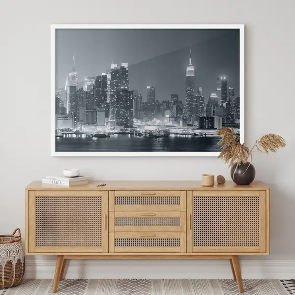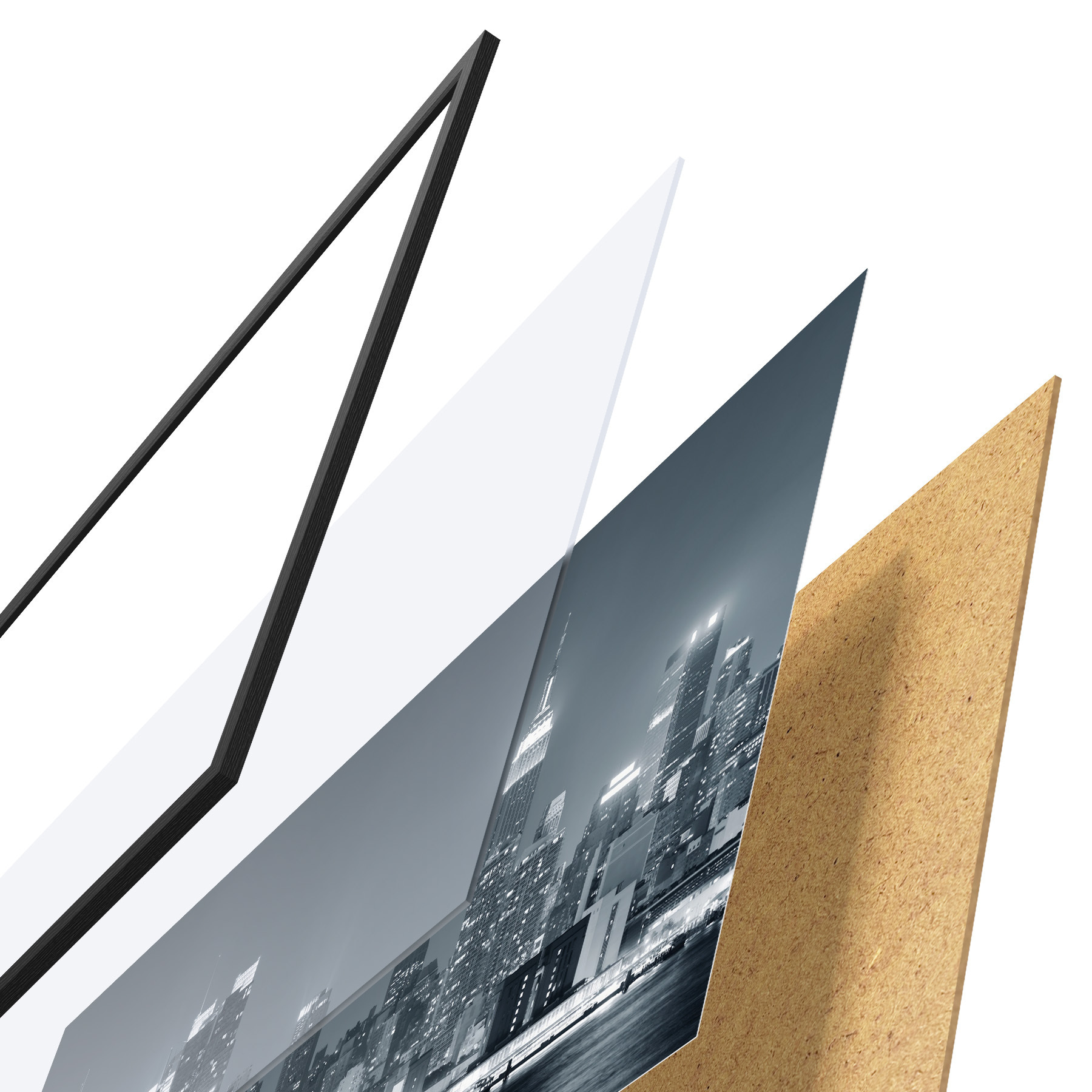 El póster consta de marco, plexiglás, imagen impresa y soporte de aglomerado. El póster puede colgarse inmediatamente en la pared gracias a los soportes de la parte posterior.