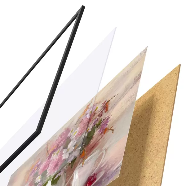 El póster consta de marco, plexiglás, imagen impresa y soporte de aglomerado. El póster puede colgarse inmediatamente en la pared gracias a los soportes de la parte posterior.