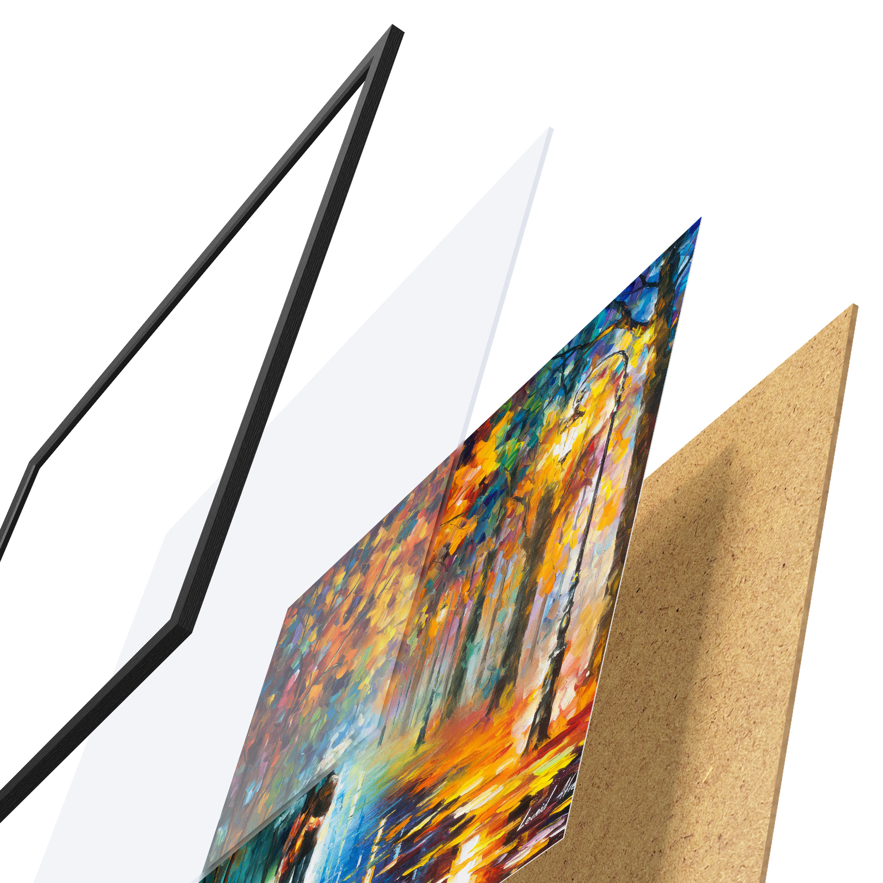 El póster consta de marco, plexiglás, imagen impresa y soporte de aglomerado. El póster puede colgarse inmediatamente en la pared gracias a los soportes de la parte posterior.