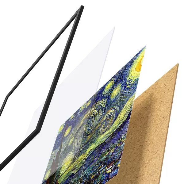 El póster consta de marco, plexiglás, imagen impresa y soporte de aglomerado. El póster puede colgarse inmediatamente en la pared gracias a los soportes de la parte posterior.