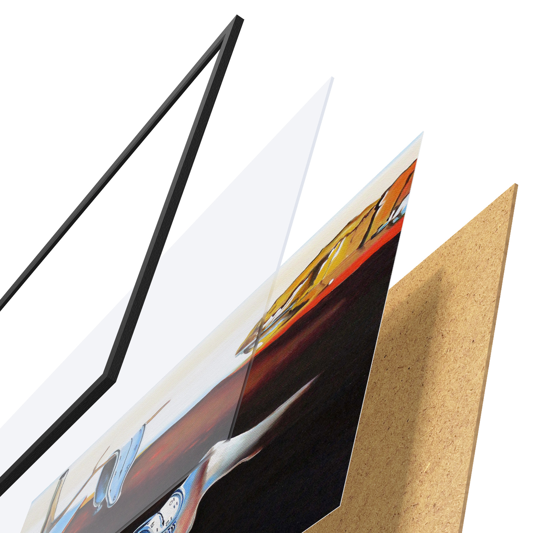 El póster consta de marco, plexiglás, imagen impresa y soporte de aglomerado. El póster puede colgarse inmediatamente en la pared gracias a los soportes de la parte posterior.