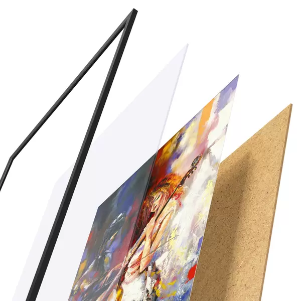 El póster consta de marco, plexiglás, imagen impresa y soporte de aglomerado. El póster puede colgarse inmediatamente en la pared gracias a los soportes de la parte posterior.