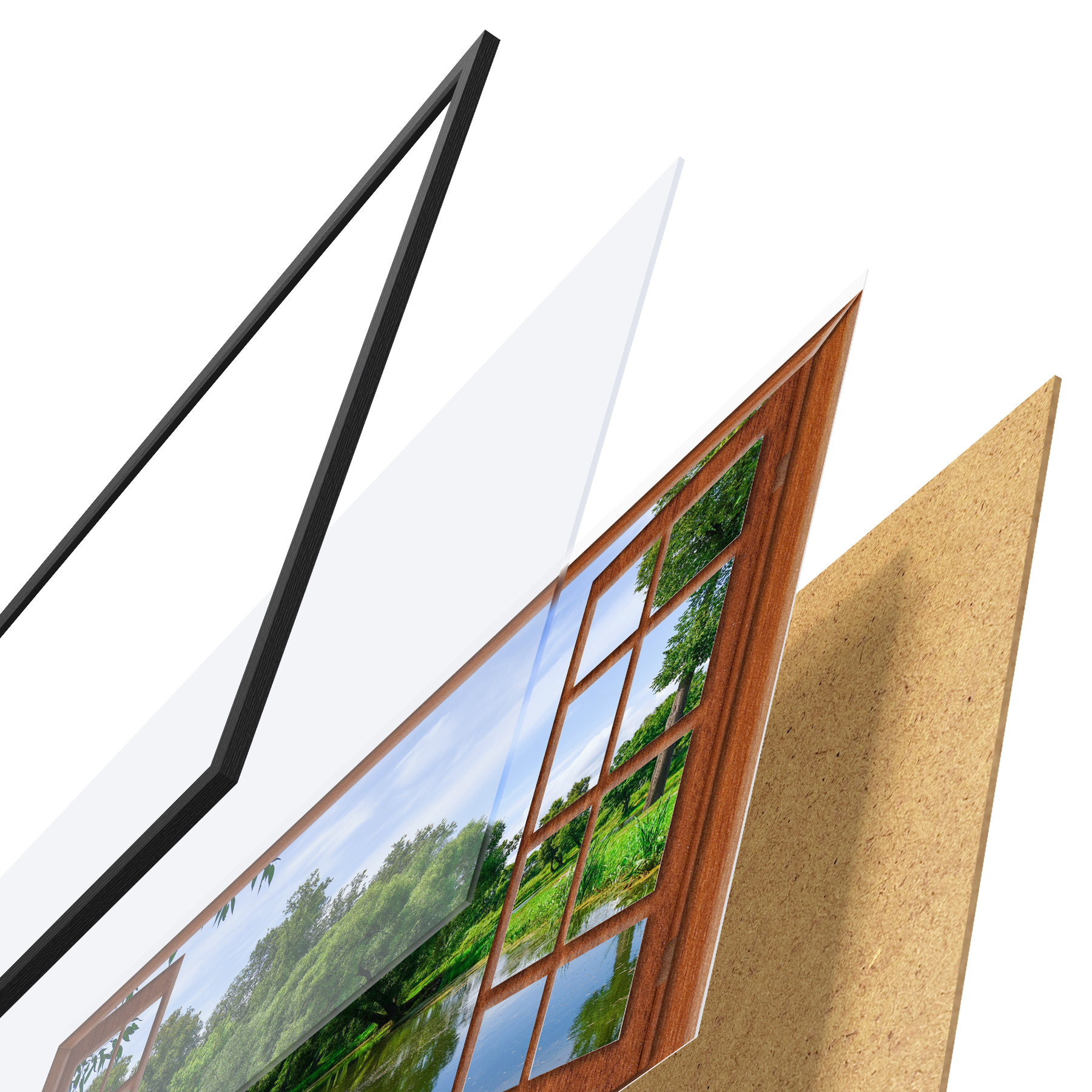 El póster consta de marco, plexiglás, imagen impresa y soporte de aglomerado. El póster puede colgarse inmediatamente en la pared gracias a los soportes de la parte posterior.