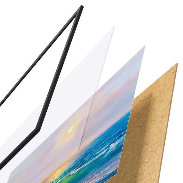 El póster consta de marco, plexiglás, imagen impresa y soporte de aglomerado. El póster puede colgarse inmediatamente en la pared gracias a los soportes de la parte posterior.