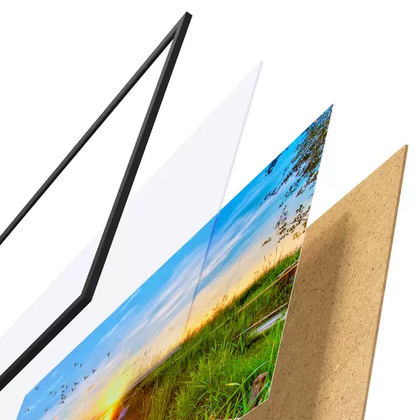 El póster consta de marco, plexiglás, imagen impresa y soporte de aglomerado. El póster puede colgarse inmediatamente en la pared gracias a los soportes de la parte posterior.