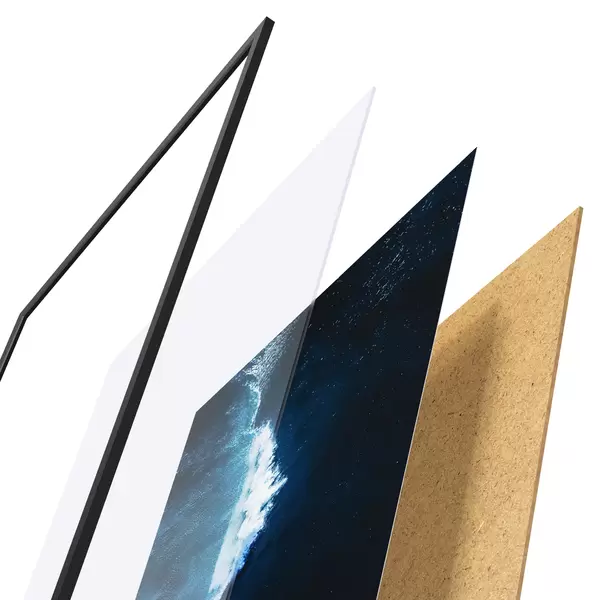 El póster consta de marco, plexiglás, imagen impresa y soporte de aglomerado. El póster puede colgarse inmediatamente en la pared gracias a los soportes de la parte posterior.