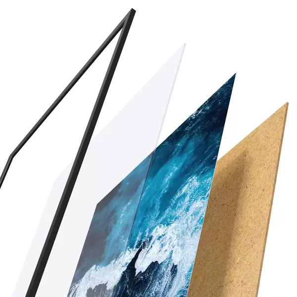 El póster consta de marco, plexiglás, imagen impresa y soporte de aglomerado. El póster puede colgarse inmediatamente en la pared gracias a los soportes de la parte posterior.