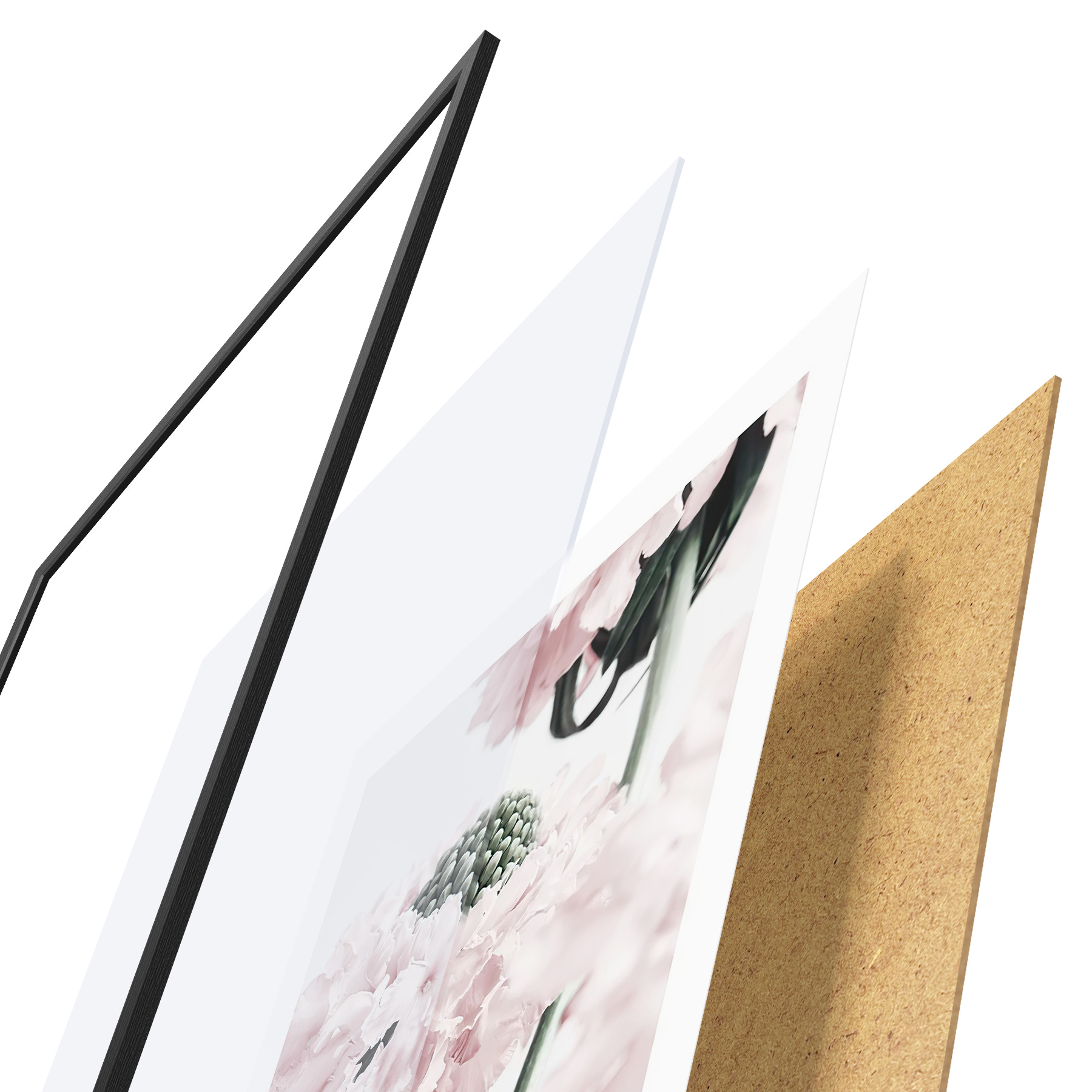 El póster consta de marco, plexiglás, imagen impresa y soporte de aglomerado. El póster puede colgarse inmediatamente en la pared gracias a los soportes de la parte posterior.
