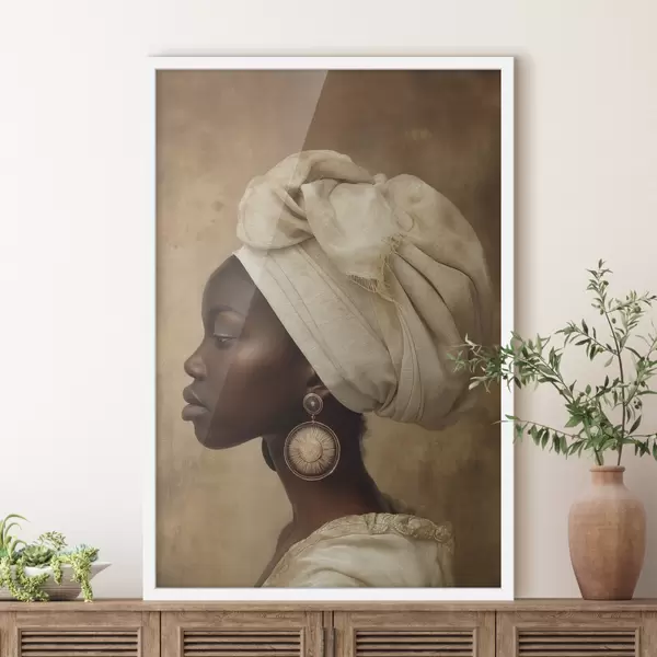 Poster retrato beige de una mujer de estilo africano de perfil con grandes pendientes f26120