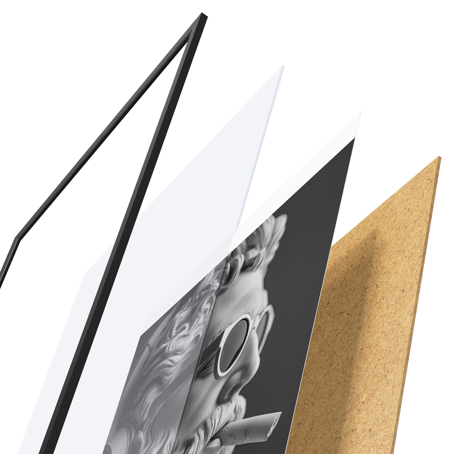 El póster consta de marco, plexiglás, imagen impresa y soporte de aglomerado. El póster puede colgarse inmediatamente en la pared gracias a los soportes de la parte posterior.