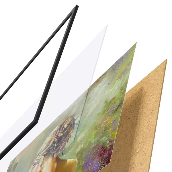 El póster consta de marco, plexiglás, imagen impresa y soporte de aglomerado. El póster puede colgarse inmediatamente en la pared gracias a los soportes de la parte posterior.