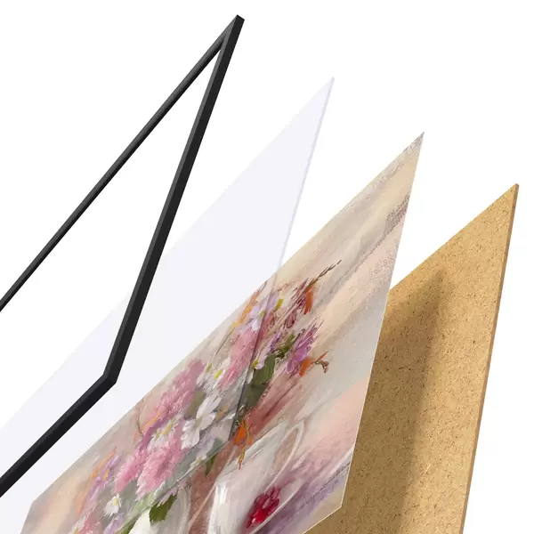 El póster consta de marco, plexiglás, imagen impresa y soporte de aglomerado. El póster puede colgarse inmediatamente en la pared gracias a los soportes de la parte posterior.
