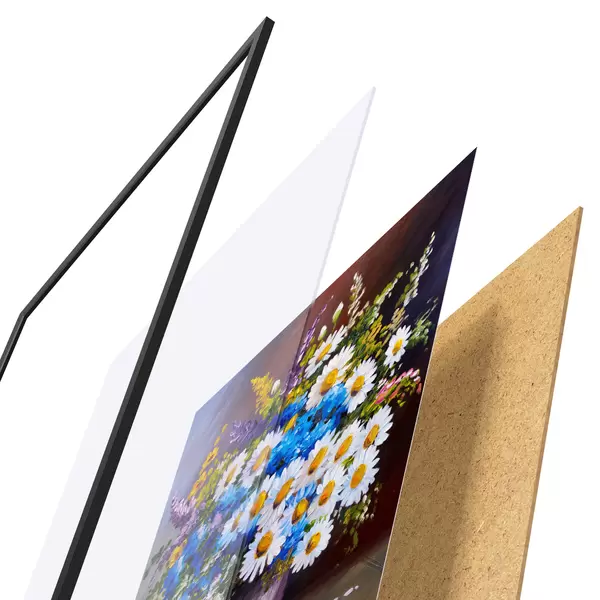 El póster consta de marco, plexiglás, imagen impresa y soporte de aglomerado. El póster puede colgarse inmediatamente en la pared gracias a los soportes de la parte posterior.