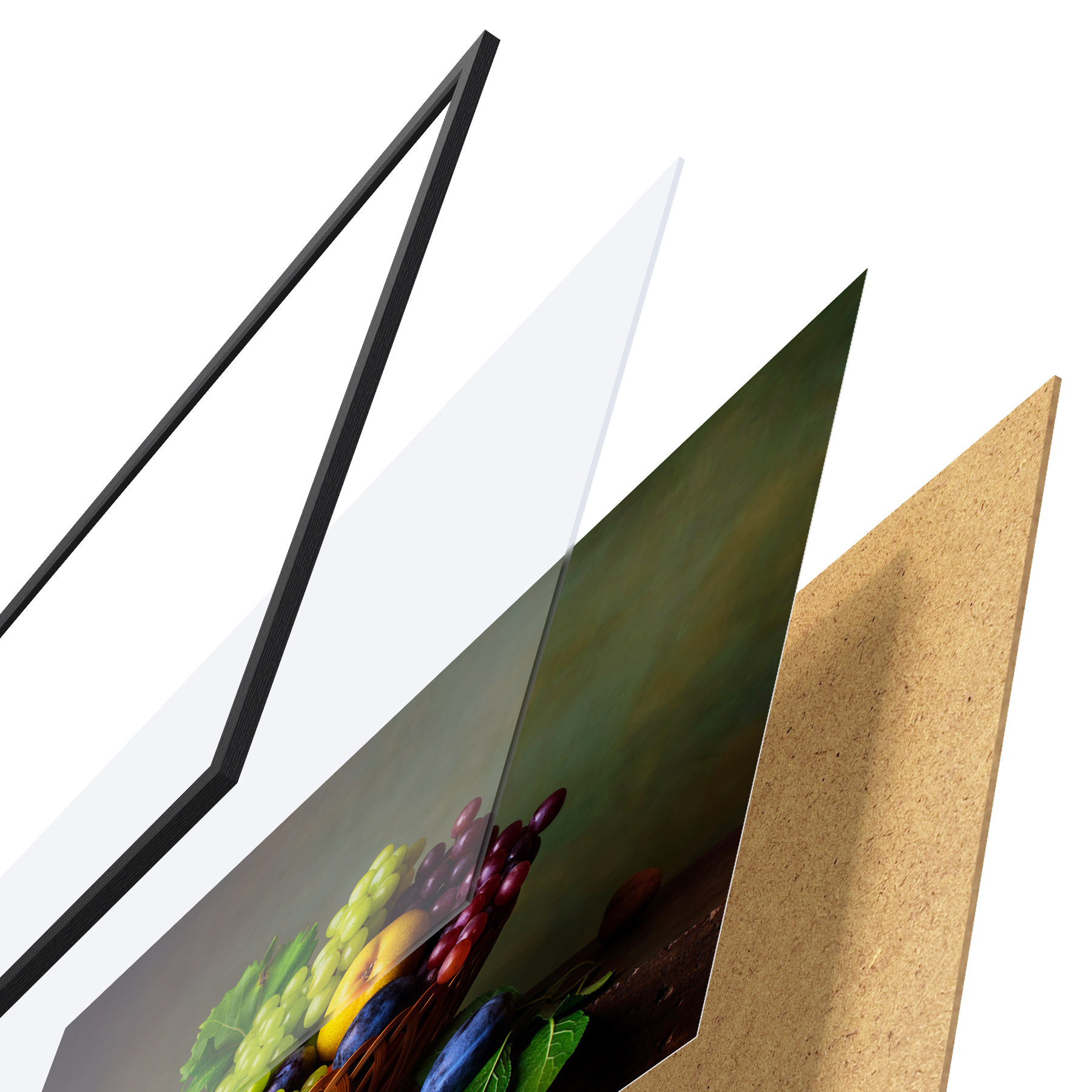 El póster consta de marco, plexiglás, imagen impresa y soporte de aglomerado. El póster puede colgarse inmediatamente en la pared gracias a los soportes de la parte posterior.