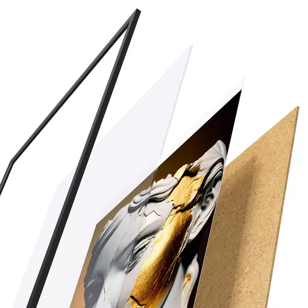 El póster consta de marco, plexiglás, imagen impresa y soporte de aglomerado. El póster puede colgarse inmediatamente en la pared gracias a los soportes de la parte posterior.