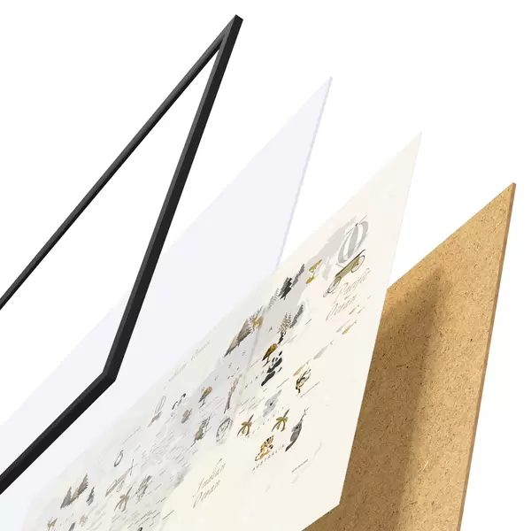 El póster consta de marco, plexiglás, imagen impresa y soporte de aglomerado. El póster puede colgarse inmediatamente en la pared gracias a los soportes de la parte posterior.