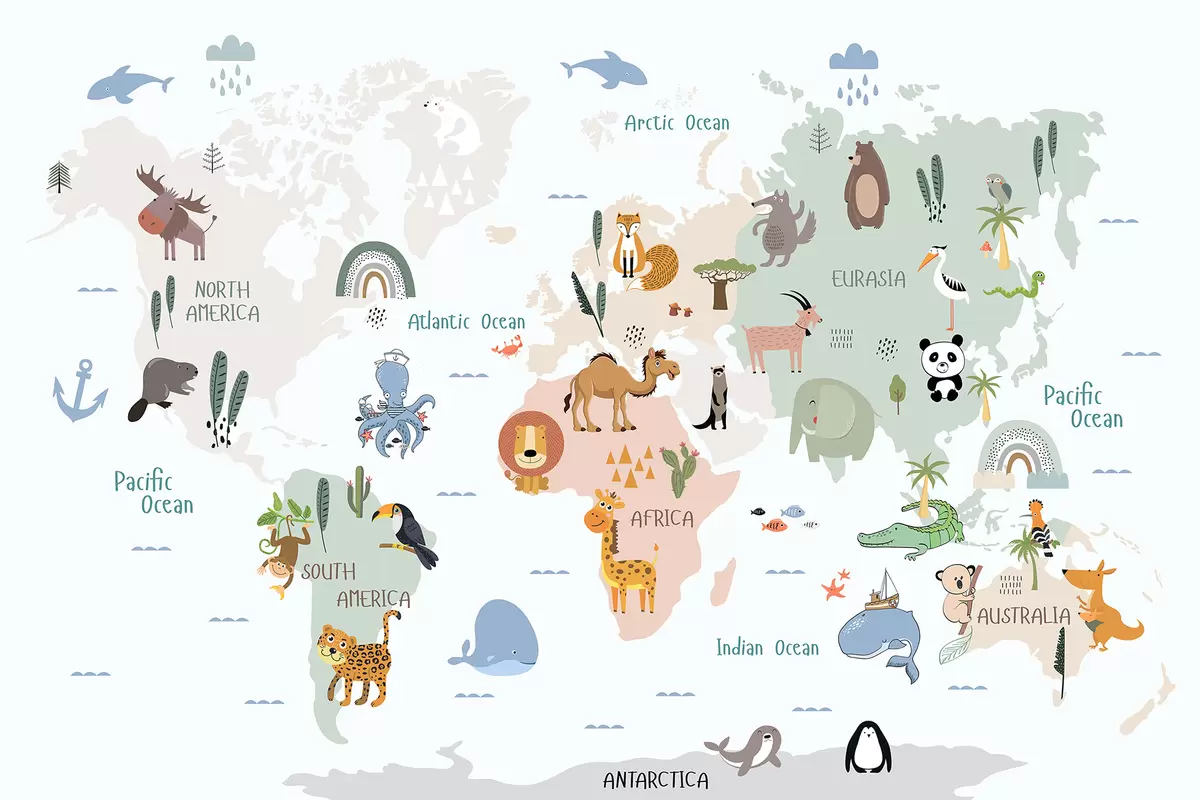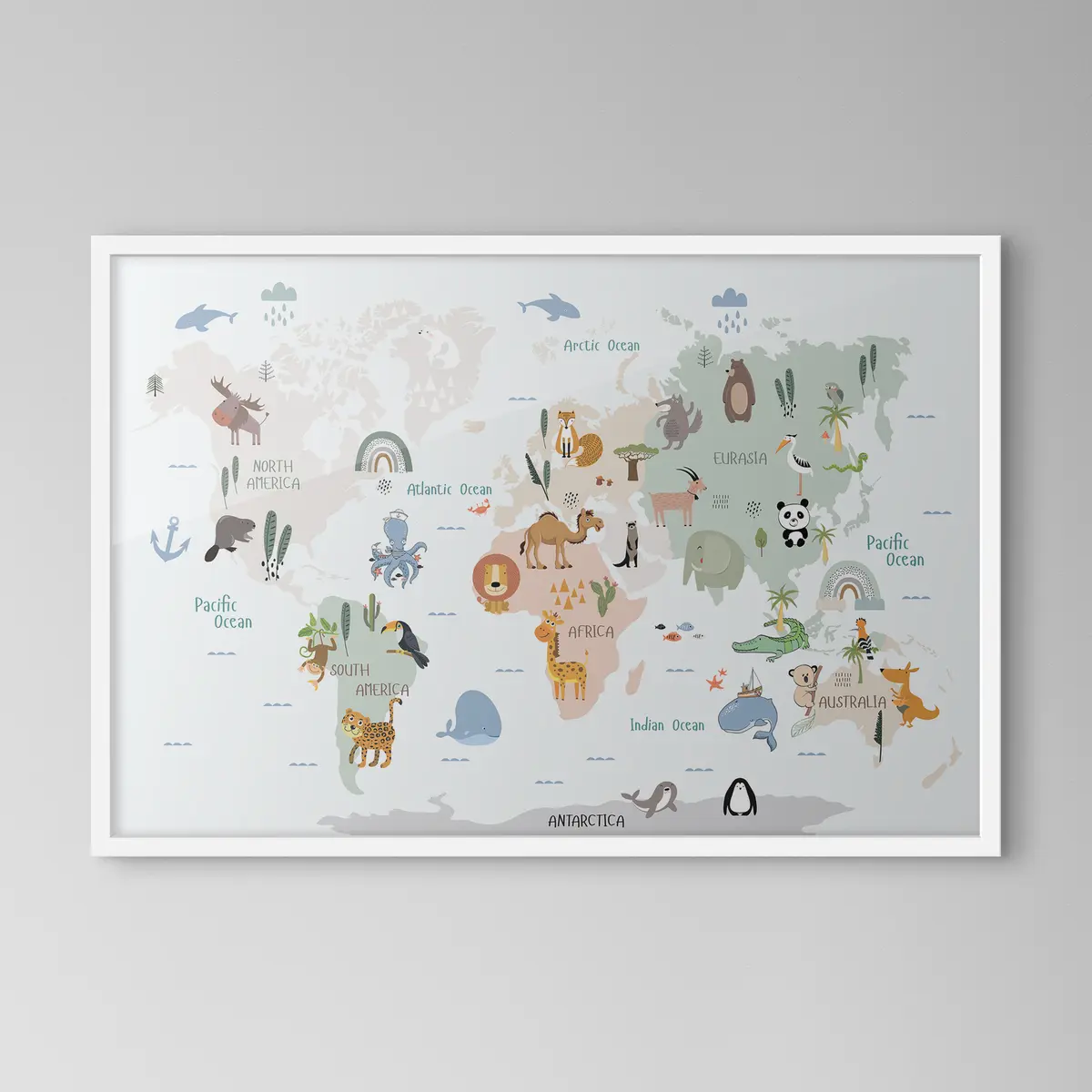 Poster Ilustración caprichosa del mapa mundial de animales f32082