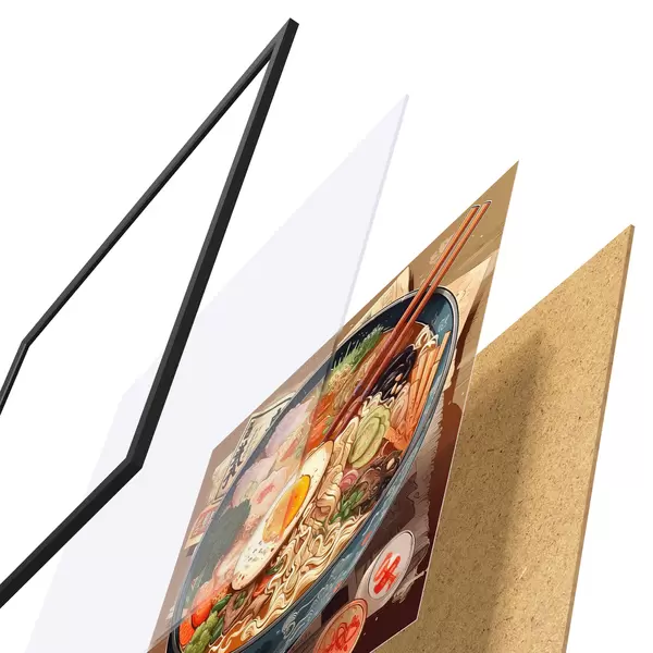 El póster consta de marco, plexiglás, imagen impresa y soporte de aglomerado. El póster puede colgarse inmediatamente en la pared gracias a los soportes de la parte posterior.