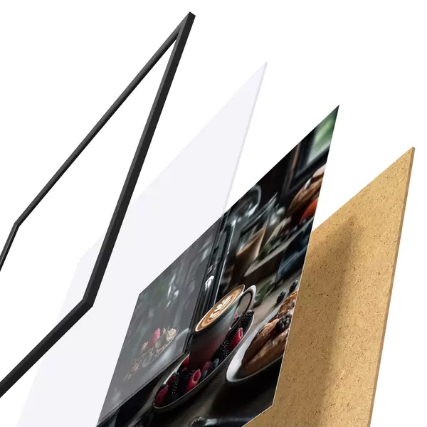 El póster consta de marco, plexiglás, imagen impresa y soporte de aglomerado. El póster puede colgarse inmediatamente en la pared gracias a los soportes de la parte posterior.