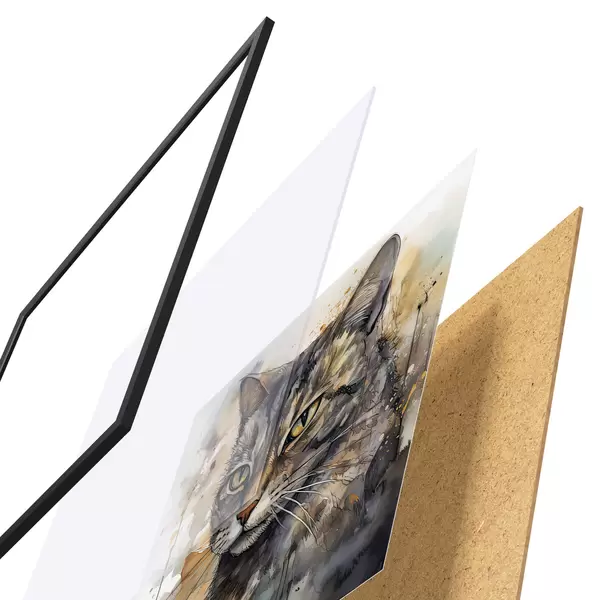 El póster consta de marco, plexiglás, imagen impresa y soporte de aglomerado. El póster puede colgarse inmediatamente en la pared gracias a los soportes de la parte posterior.