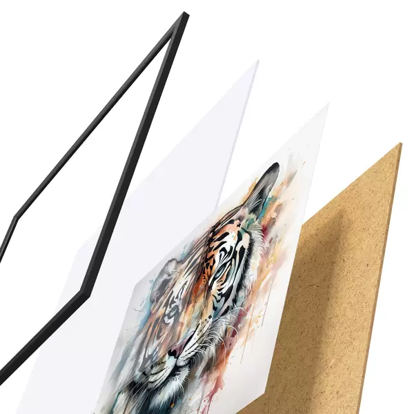 El póster consta de marco, plexiglás, imagen impresa y soporte de aglomerado. El póster puede colgarse inmediatamente en la pared gracias a los soportes de la parte posterior.