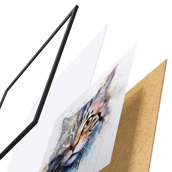 El póster consta de marco, plexiglás, imagen impresa y soporte de aglomerado. El póster puede colgarse inmediatamente en la pared gracias a los soportes de la parte posterior.