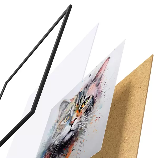 El póster consta de marco, plexiglás, imagen impresa y soporte de aglomerado. El póster puede colgarse inmediatamente en la pared gracias a los soportes de la parte posterior.