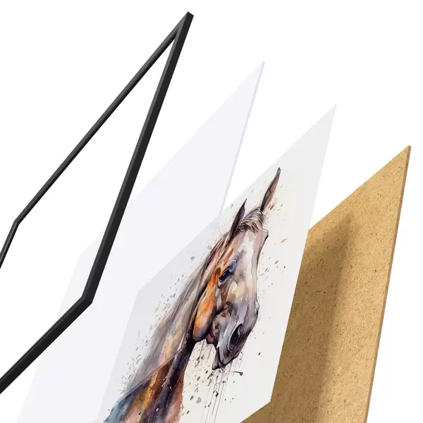 El póster consta de marco, plexiglás, imagen impresa y soporte de aglomerado. El póster puede colgarse inmediatamente en la pared gracias a los soportes de la parte posterior.