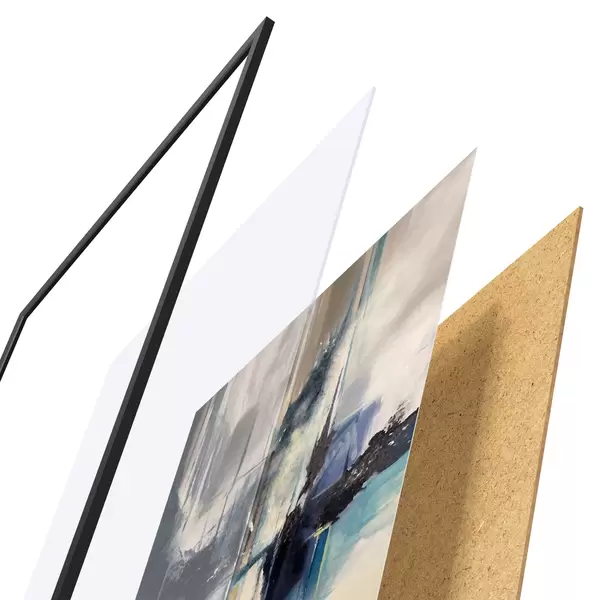 El póster consta de marco, plexiglás, imagen impresa y soporte de aglomerado. El póster puede colgarse inmediatamente en la pared gracias a los soportes de la parte posterior.